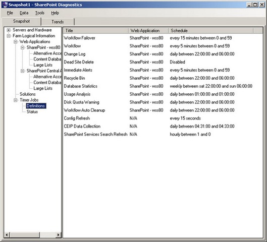 The more interesting information from my perspective that provides for quick and simple analysis of a farm are the solutions and timer job definitions information that can quickly be glanced at.