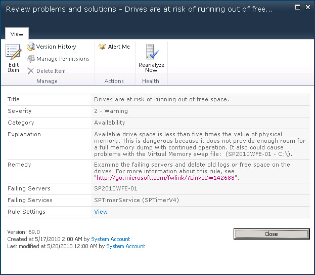 One of the new capabilities of SharePoint 2010 that comes in handy is the Health Monitoring alerts that pop up on the front page of Central Admin. One thing you might run into is when you start to run out of disk space. You’ll probably see something similar to this: