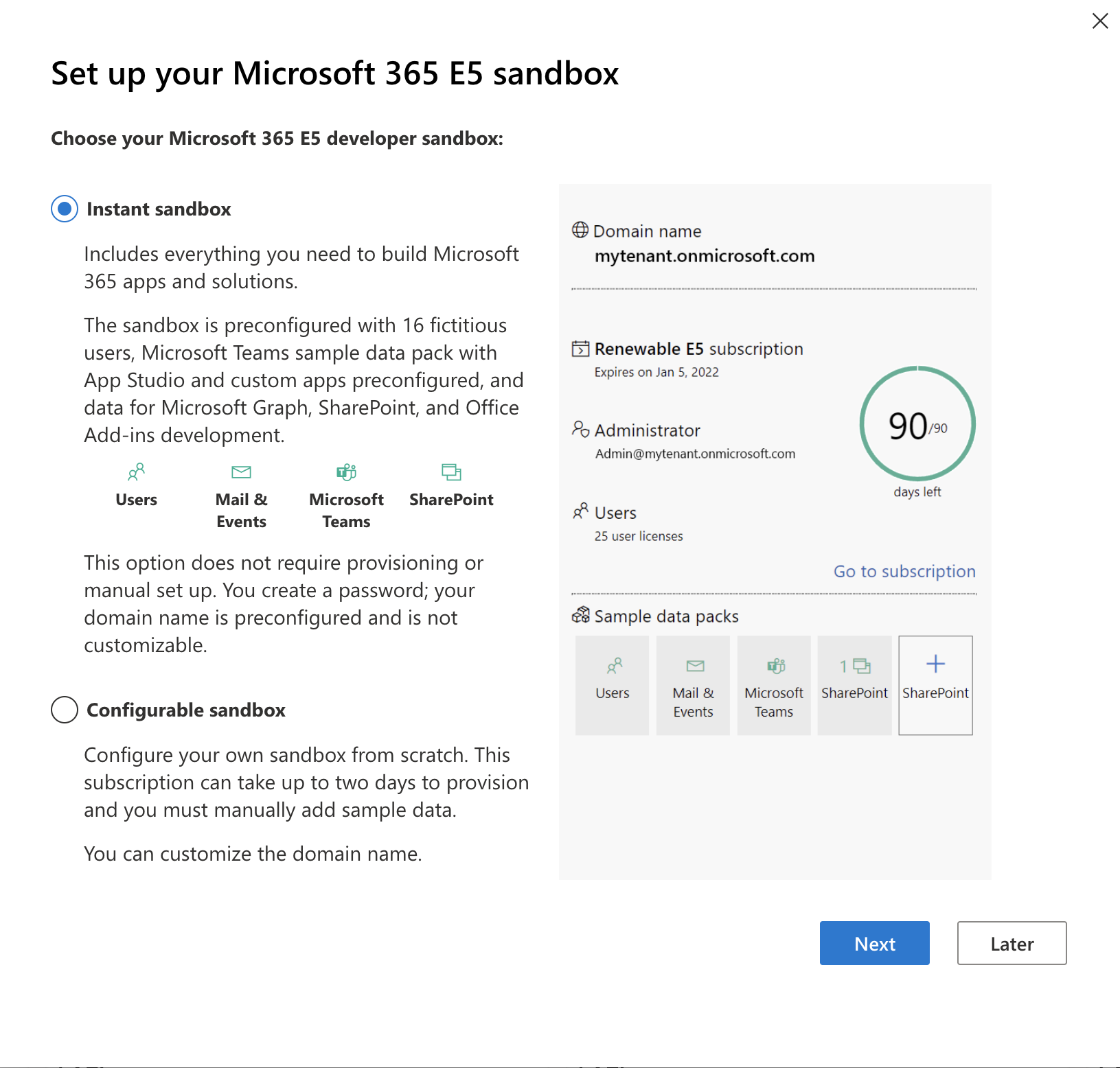 If you’re a Developer and you need a place to quickly jump in and establish a Microsoft Azure / 365 tenant that you can use for your development purposes, you’re in the right spot. The Developer Tenant is good for 90 days and can come pre-provisioned with sample data packs to help in testing common scenarios.